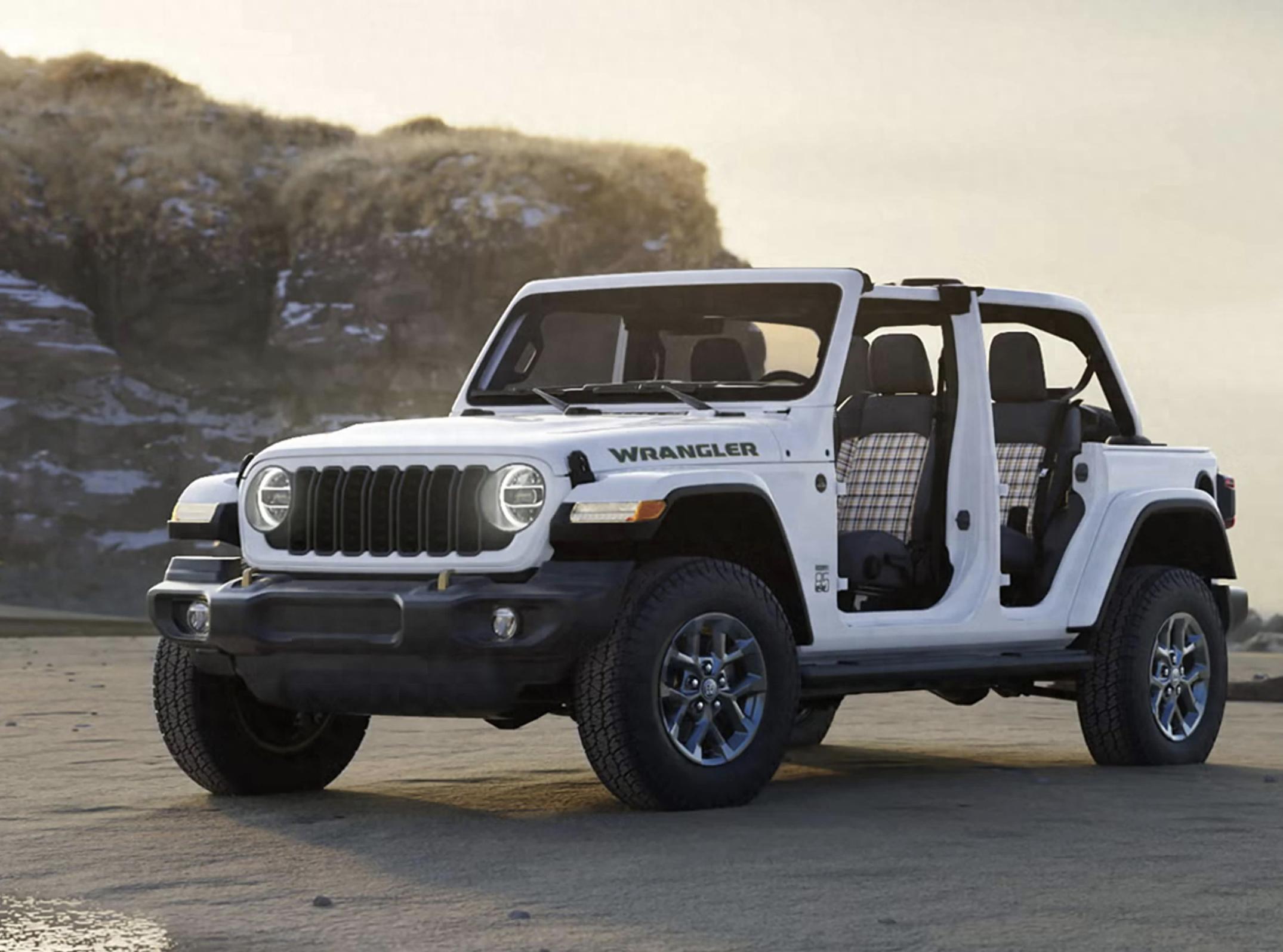 车身侧面,Jeep牧马人85周年纪念版采用了特殊的车身轮廓,运用了特殊调制的白色车漆涂装,并加入了车身同色挡泥板,黑色软顶敞篷的车顶也让整车变得更加特别,可拆卸式的车门和机械门锁也展现出了更多工业时代的气息。外凸的前后轮眉与侧裙融为一体式设计,配备了黑色的大尺寸迎宾踏板,还有17英寸的熏黑双五辐式轮圈,与之匹配了255/55 R17轮胎,还加入了大尺寸刹车盘和银色的多活塞卡钳,徒增了更多的野性。最大支持33英寸的越野胎。细节方面,前舱盖两侧配备了“WRANGLER”拉花设计,门板处还会拥有专属的85周年纪念徽章,以显示出该车的特色身份。