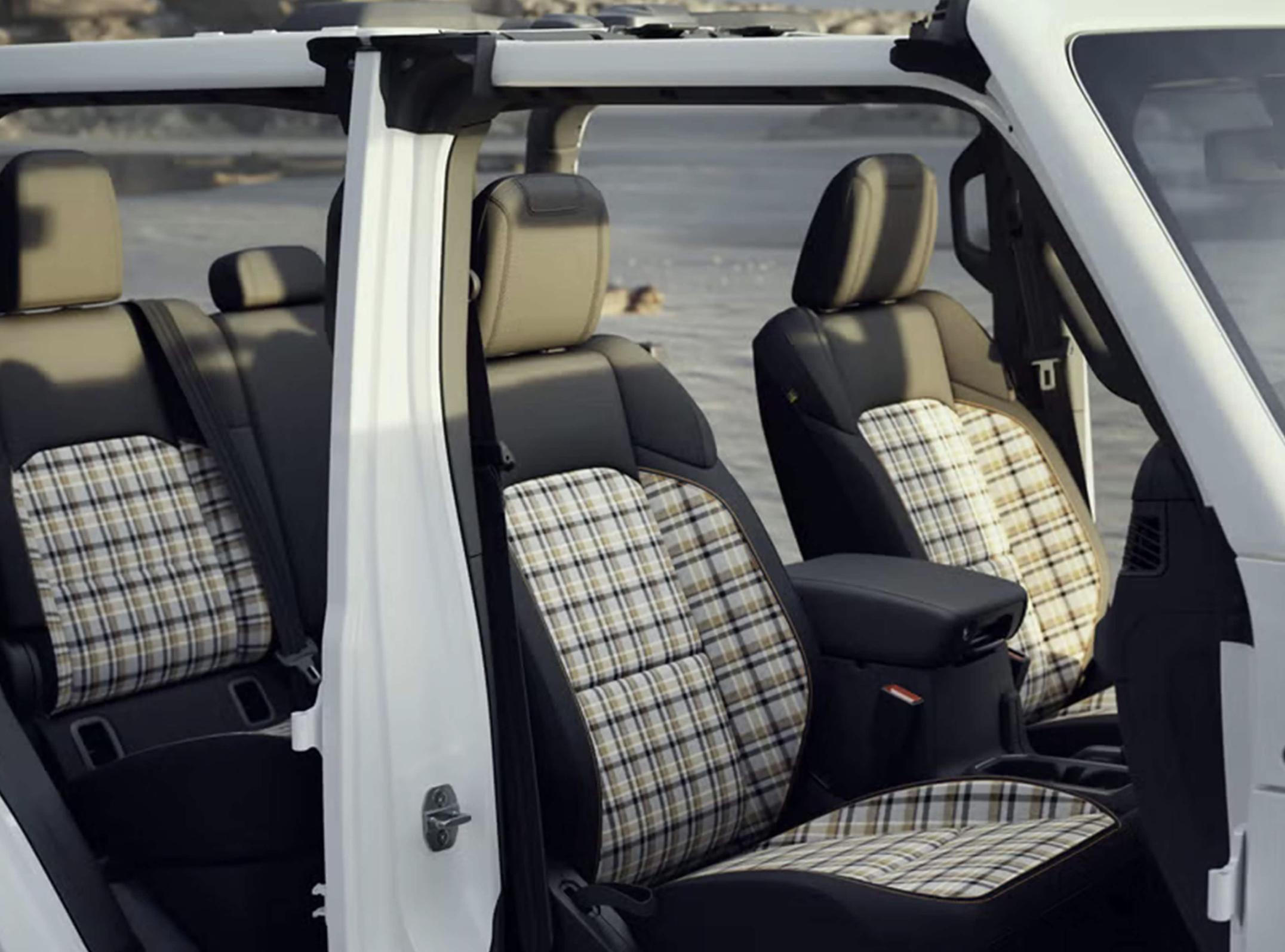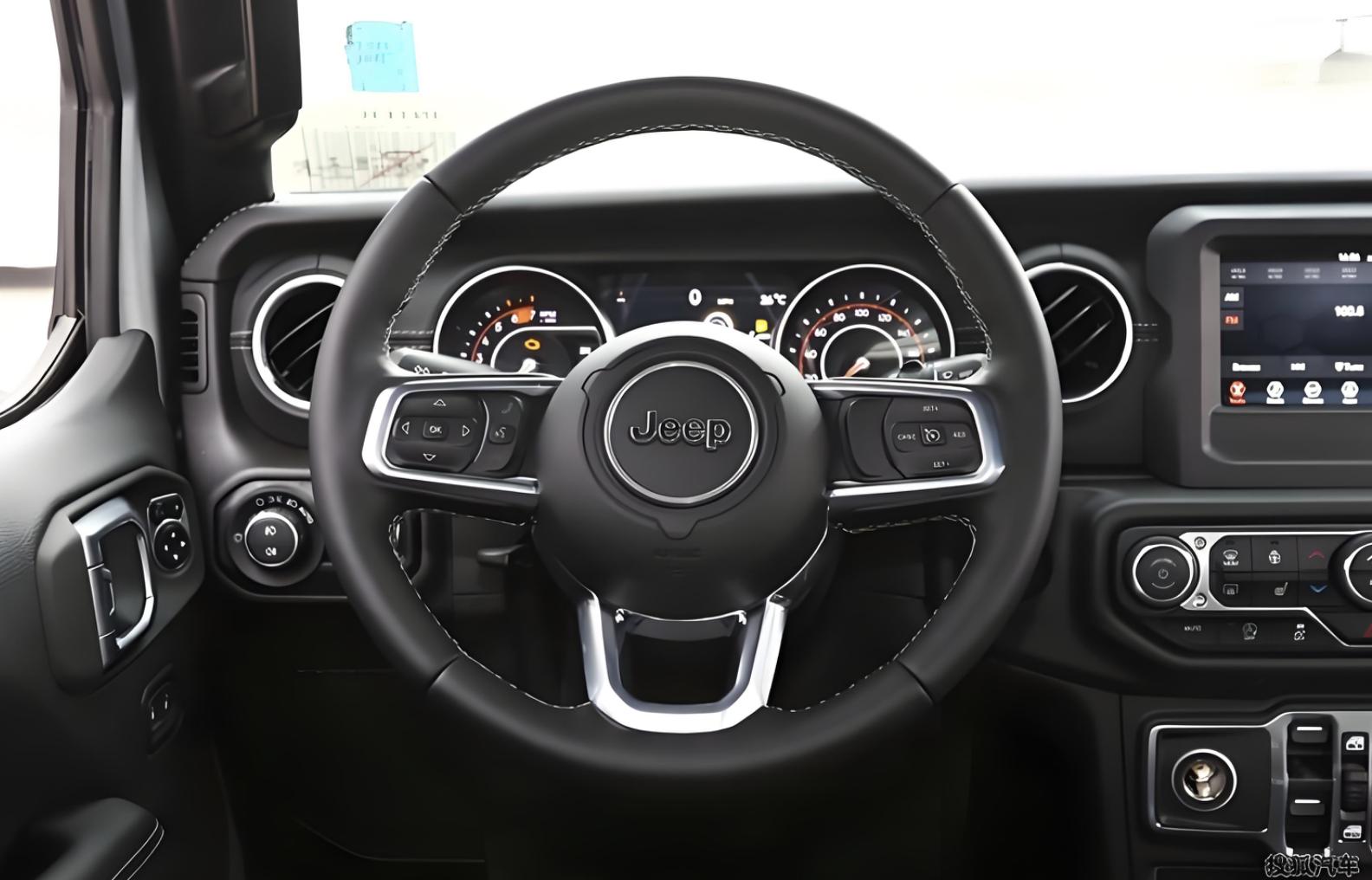 进入车内,Jeep牧马人85周年纪念版车内采用棕色的翻毛皮材质的包裹,再加上黑色真皮材质以及银色镀铬装饰,质感柔软细腻,做工精致、用料考究。标准的T字形中控台配备了12.3英寸的液晶仪表和14.5英寸的中控屏,这也是Jeep品牌使用过的最大尺寸屏幕。操控岛配备了无线充电模块,还加入了大颗粒按键,保留了经典的旋钮式换挡机构,还有黑色的滚轮设计,侧面还有两个标准的杯架。搭载了Jeep Uconnect 5信息娱乐系统。车内配备了黑色皮革材质和格子纹路衬布的交替混搭材质,与高尔夫GTI十分相似,也提升了整车的独特性。